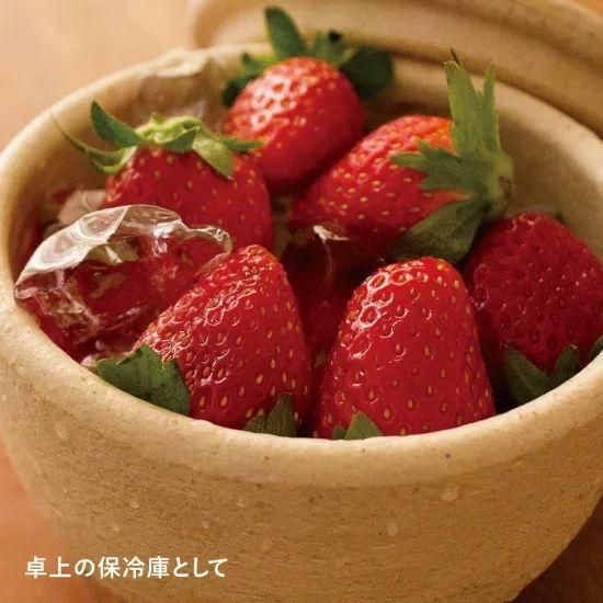 呼吸する素地の特徴をいかせば、素地が含んだ水分が外側から蒸発するときの気化熱で「陶珍」内部が冷えます。冷たい料理を冷たいまま保つ保冷器・盛り付けた食材の鮮度を保つ保存器としてお使いいただけます。