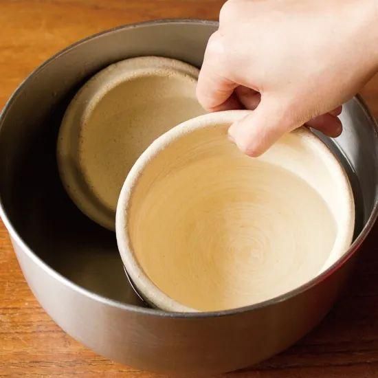 (1)ボウルに水を張り、「陶珍」を入れてふた・本体に十分水を含ませる。約1分で水から上げ、表面の水気を拭く。